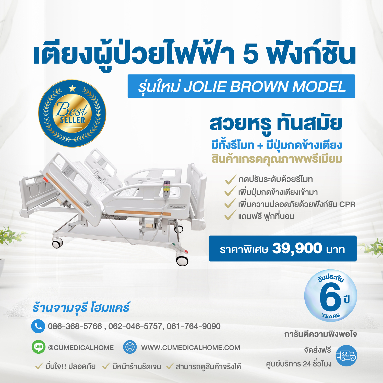 "รุ่นพิเศษ Jolie Brown Model หรูหรา ทันสมัย มีปุ่มกดที่ข้างเตียงเพิ่มเข้ามา เพิ่มความปลอดภัยด้วยฟังก์ชั่น CPR มีปุ่มกดที่ข้างเตียง (Nurse Control Panel) มีแบตเตอรี่สำรองไฟฟ้าเวลาไฟดับ"