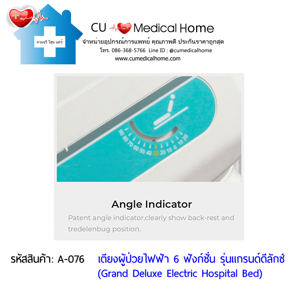 - ด้านข้างตัวเตียงจะมีลูกตุ้มบอกองศาการปรับระดับเตียง (Angle Indicator) เพื่อทำให้ผู้ใช้งานรู้ว่าปรับระดับมุมไปกี่องศา ซึ่งเป็นมาตรฐานด้านความปลอดภัยที่ทางโรงพยาบาลกำหนด